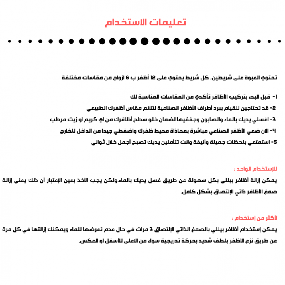 • عدد 24 أظفار بـ 6 مقاسات مختلفة.